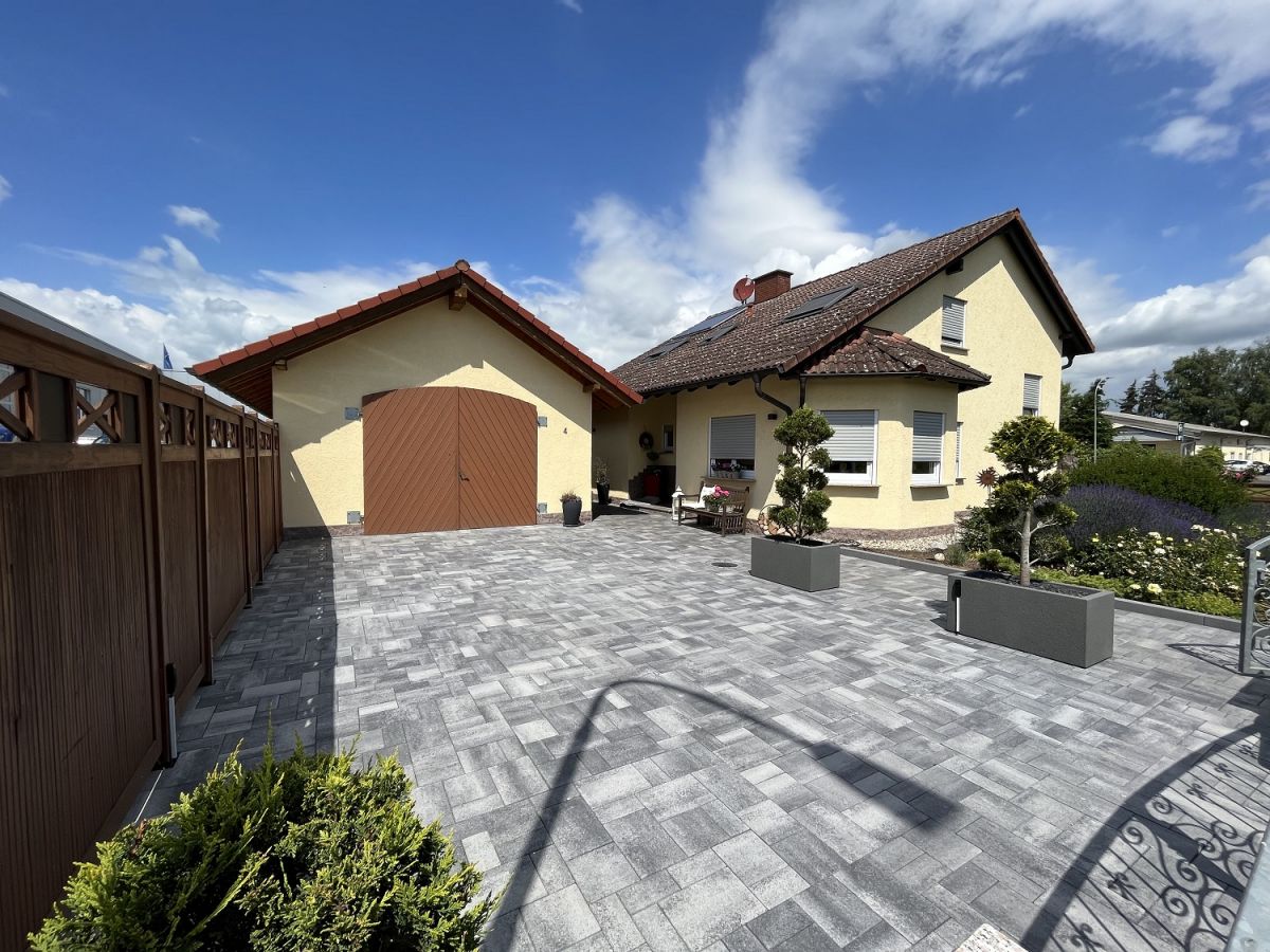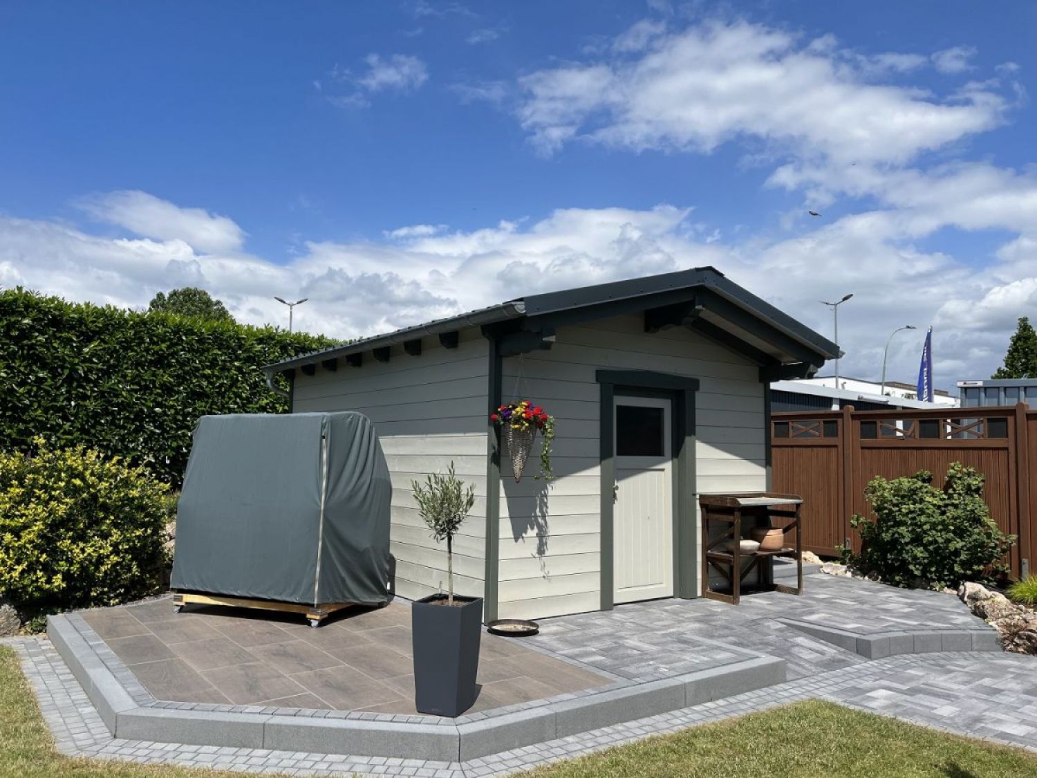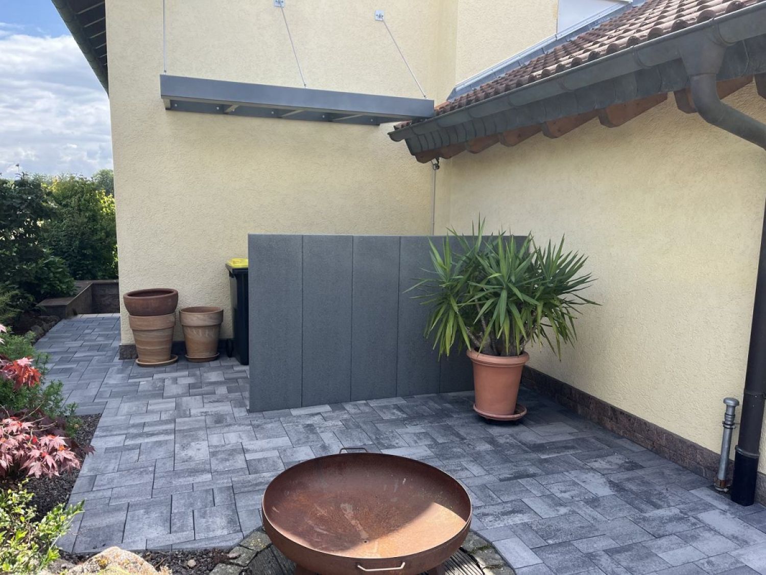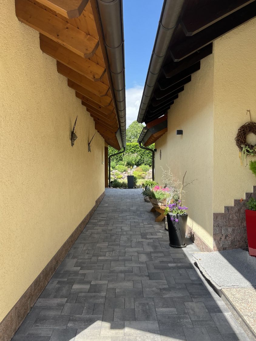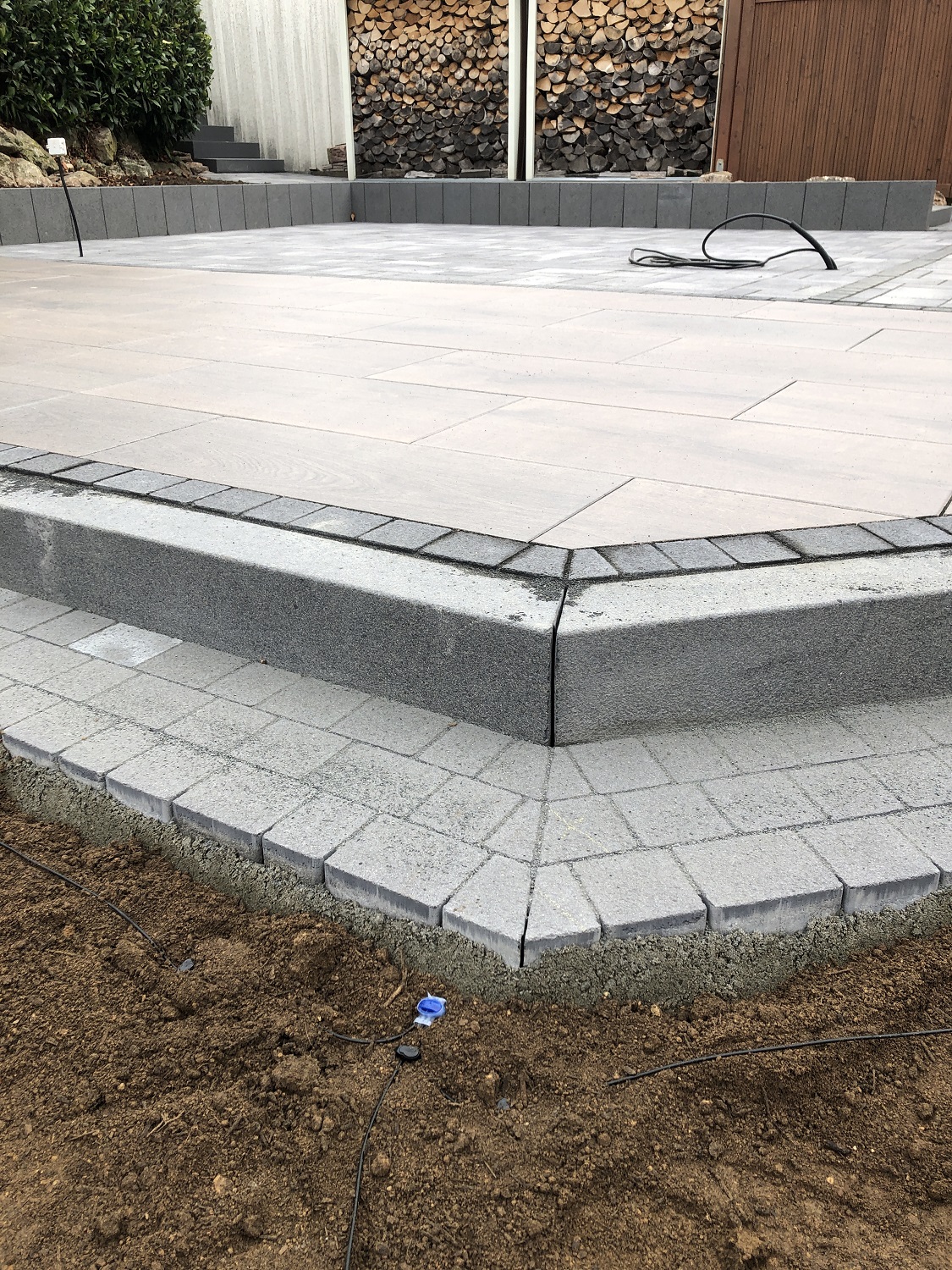 Es sollen moderne Farben und Formen her. Ein schickes Pflaster mit Grau- und Anthrazittönen, Pflanz- und Sitzkübel, sowie dazu braune Terrassenplatten. Die Kombination macht sich besonders schön, weil man das Gartenhaus, sowie auch die Balken des Hausen in einem modernen Graugrün gestrichen hat. (Dazu werde ich nochmal Bilder machen, da hier die Balken am Haus noch in der alten Farbe waren.)
