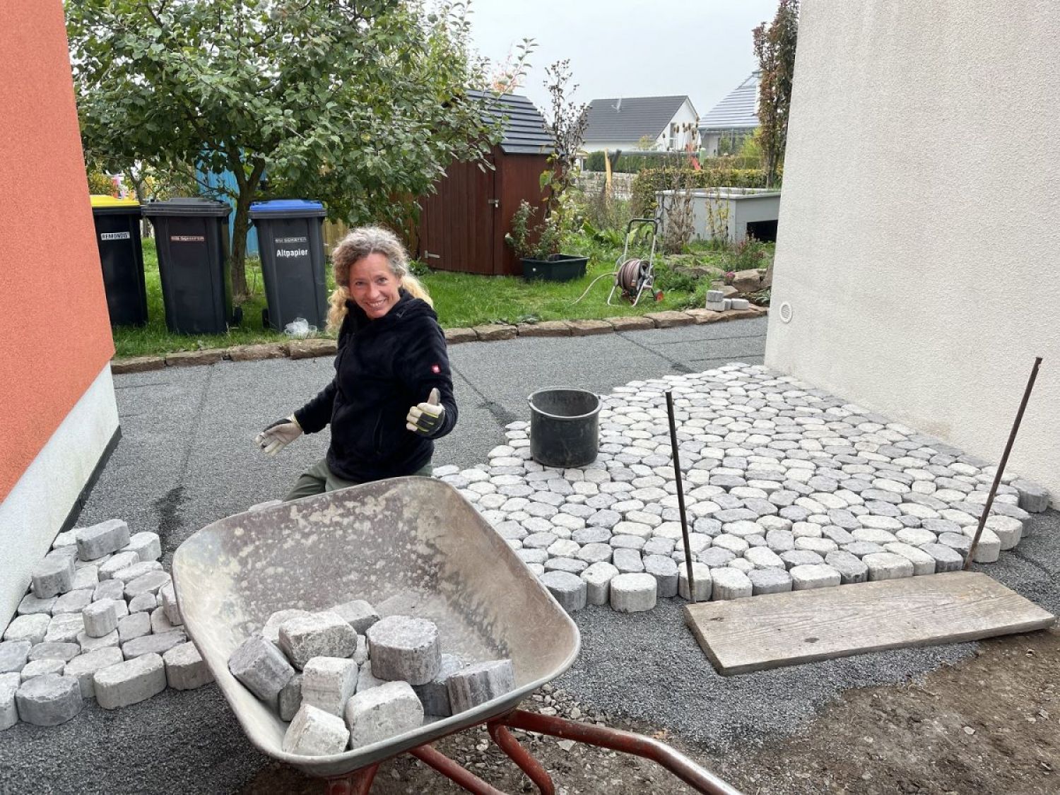 Und wenn die Sonne schein, dann sind wir auch am glücklichsten, wie man sieht. Die Einfassung und die Kreisbögen mit Naturstein-Pflaster passt wunderbar in Kombination mit dem Arena-Pflaster.