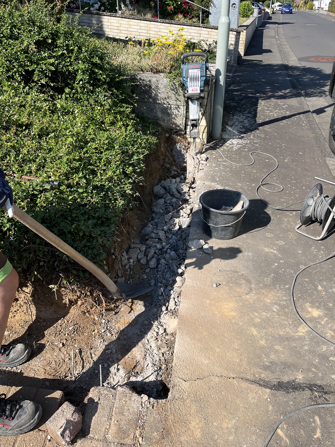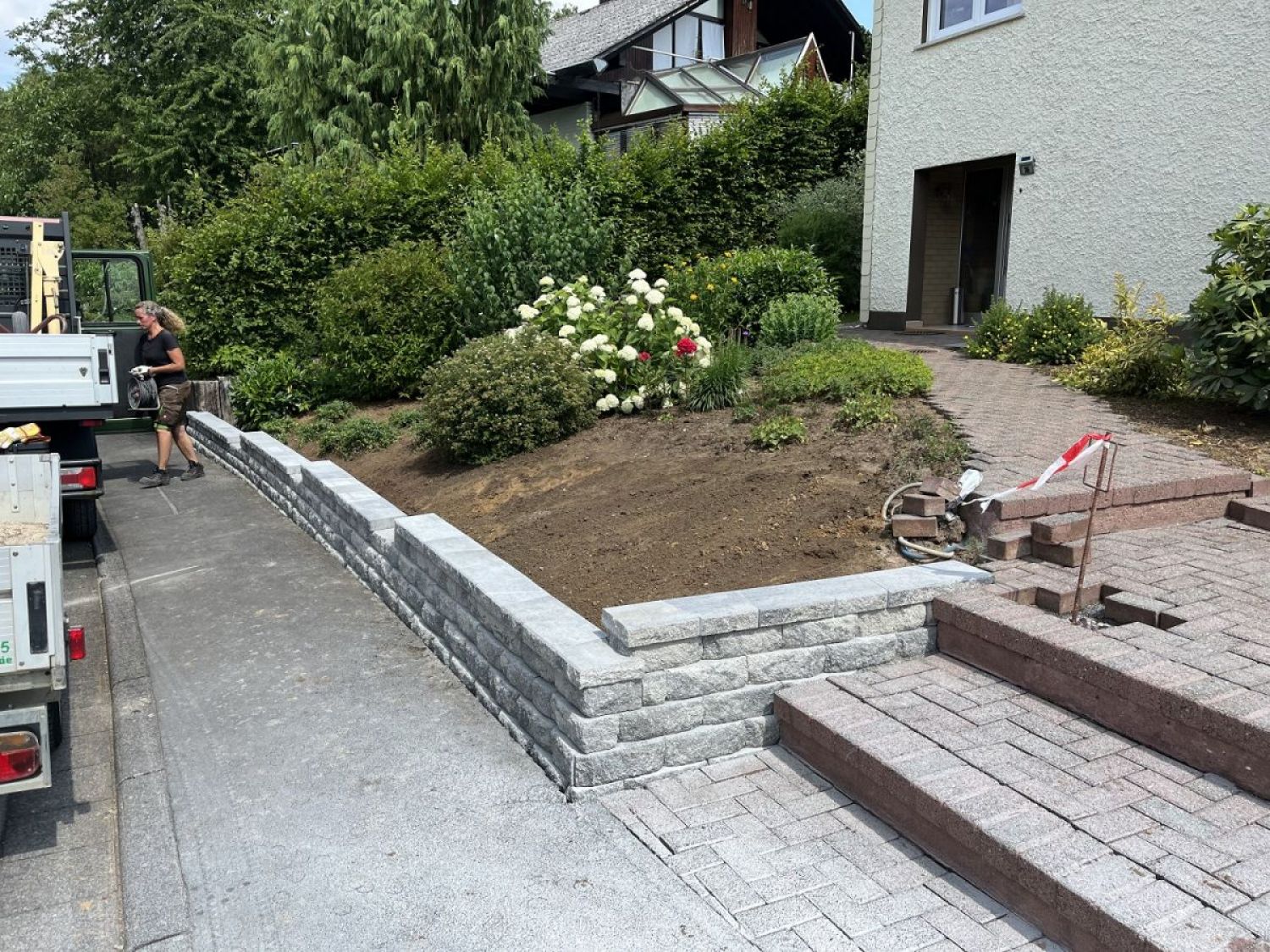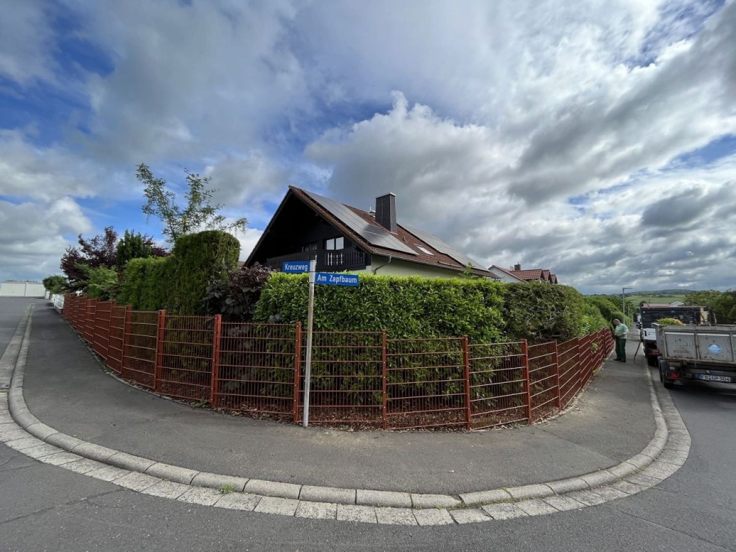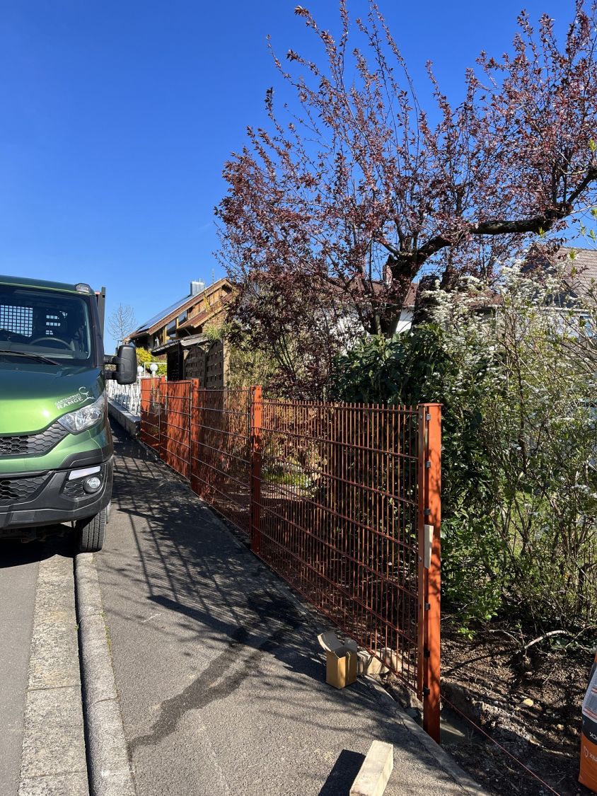 Sie benötigen den Doppelstabzaun an stärker fallendem Gelände? Dann können wir die Felder genau für die passende Neigung fertigen lassen. (Siehe Foto)