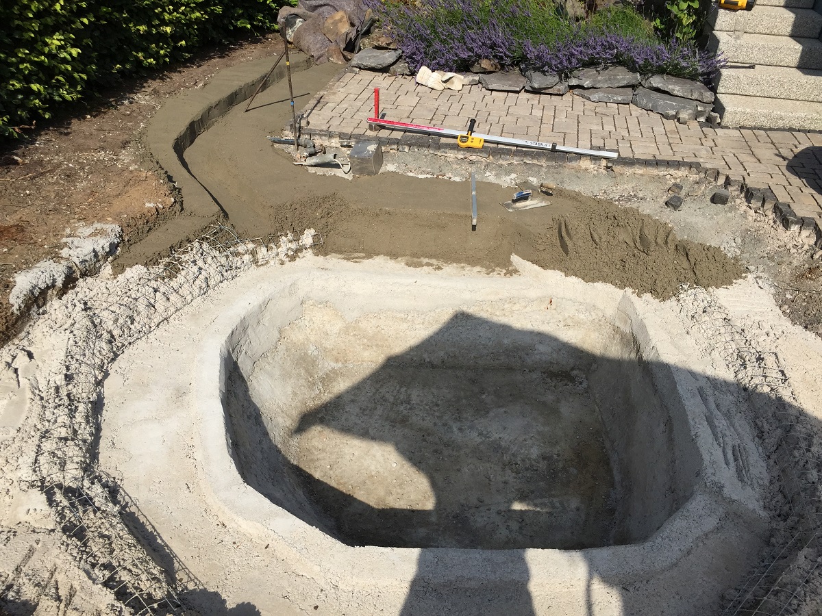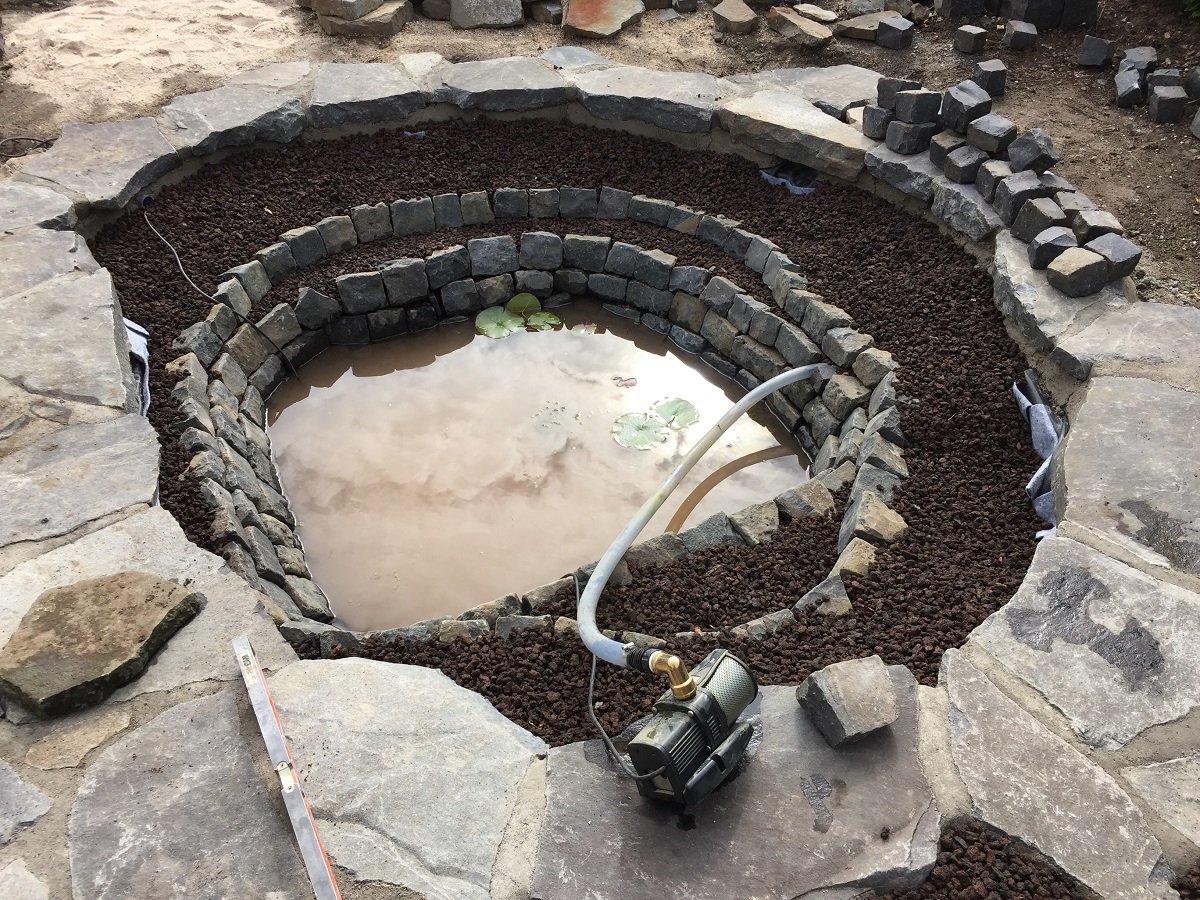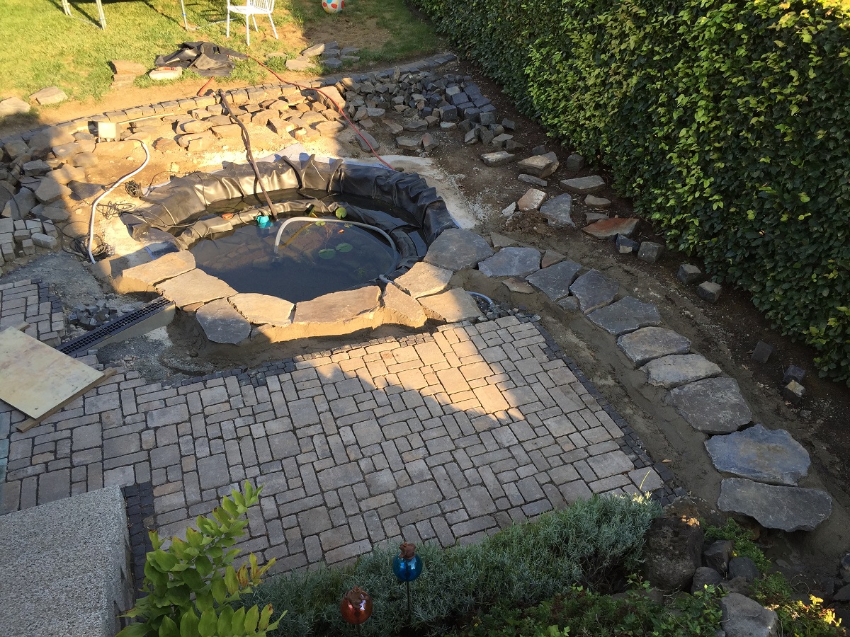 Um nun solch eine Abdeckung sicher und dauerhaft zu befestigen, genügt es nicht, einfach eine Teichfolie auszulegen. Um einen Tragfähigen Untergrund zu haben, wurde hier ein Becken mit Beton modeliert. Danach wurde ein Schutzvlies eingelegt und die Teichfolie. Doch auch im Teich wurde nochmals Schutzvlies verarbeitet. So konnte man dann auch die sichtbare Teichfläche komplett verbauen, so dass die Folie nicht mehr sichtbar ist. Der große Vorteil: Die Folie ist zusätzlich geschützt vor äußeren Einflüssen.