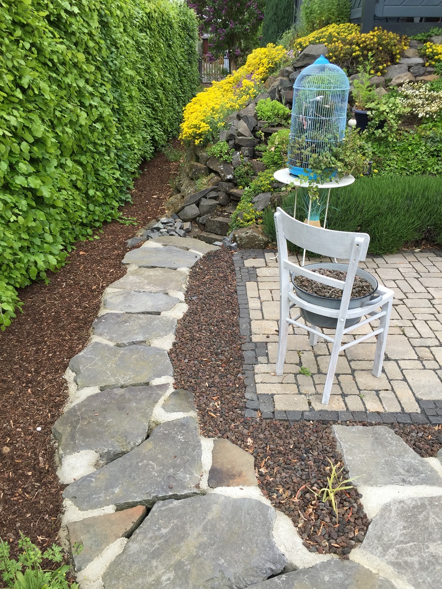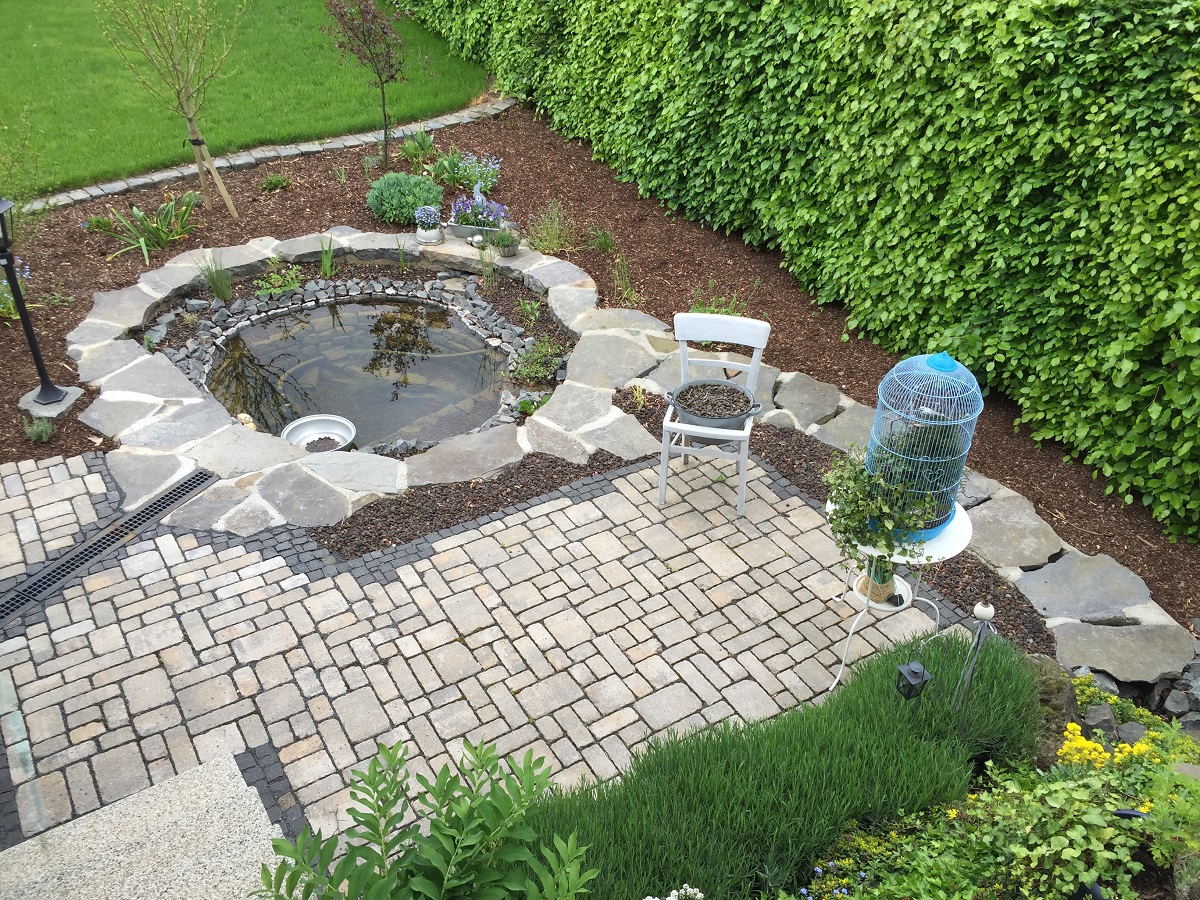Einen kleiner Teich war in die Jahre gekommen. In einfachster Weise war dieser vor gut 15 Jahren angelegt worden. Die sichtbare Folie machte im Wasser, aber vor allem auch am Teichrand keinen besonders schönen Eindruck. Also galt es nun den Teich so zu bauen, dass von einer Teichfolie nichts mehr zu sehen sein wird. Die Umrandung des teiches wurde mit Natursteinplatten aus Basalt belegt. Genauso wurde der Bachlauf im fast waagerechten Teil komplett mit diesen Platten überdeckt, so dasss man das Wasser nur noch zwischen den Fugen des Bachlaufes fließen sehen kann.